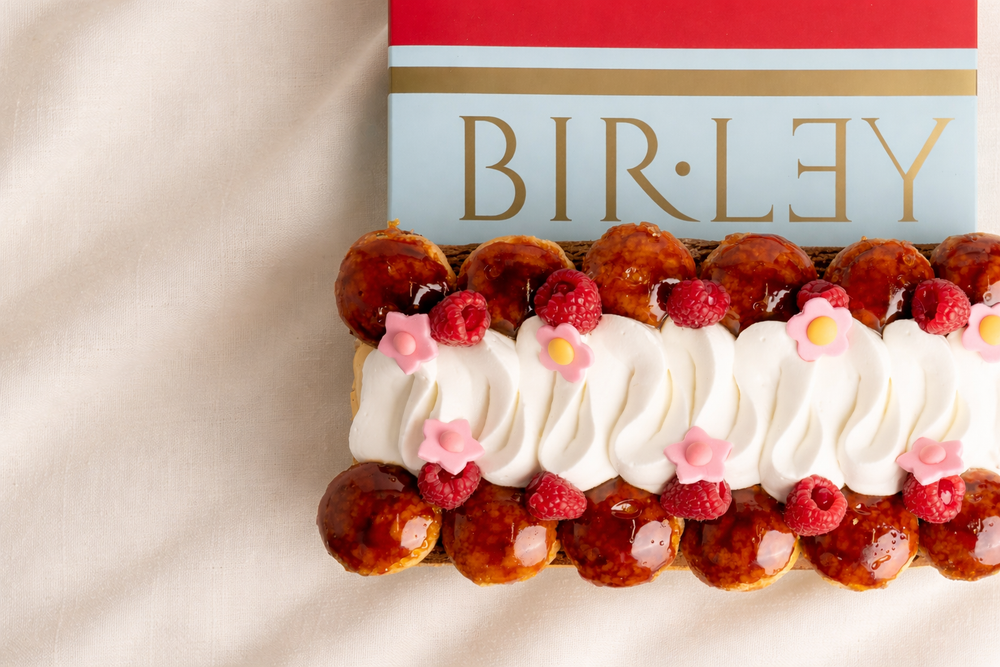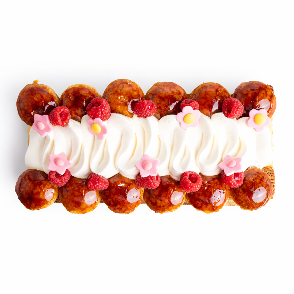 A classic French dessert made with a crisp puff pastry base and caramel glazed choux pastry. It is filled with two traditional creams: a vanilla custard and a light Chantilly cream. Our version is complemented with a raspberry coulis and a few fresh raspberries for a bright, fruity finish.