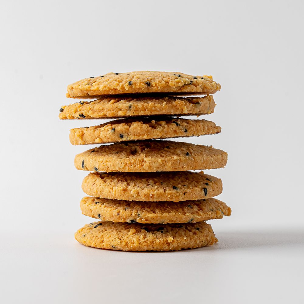 A delicate, buttery savoury biscuit made with aged Parmesan Reggiano and a hint of aromatic nigella seed. Crisp and crumbly with a subtle nuttiness, it’s the perfect accompaniment to wine, cheese boards, or simply enjoyed on its own.